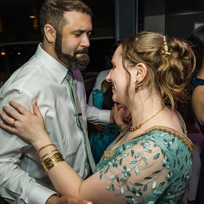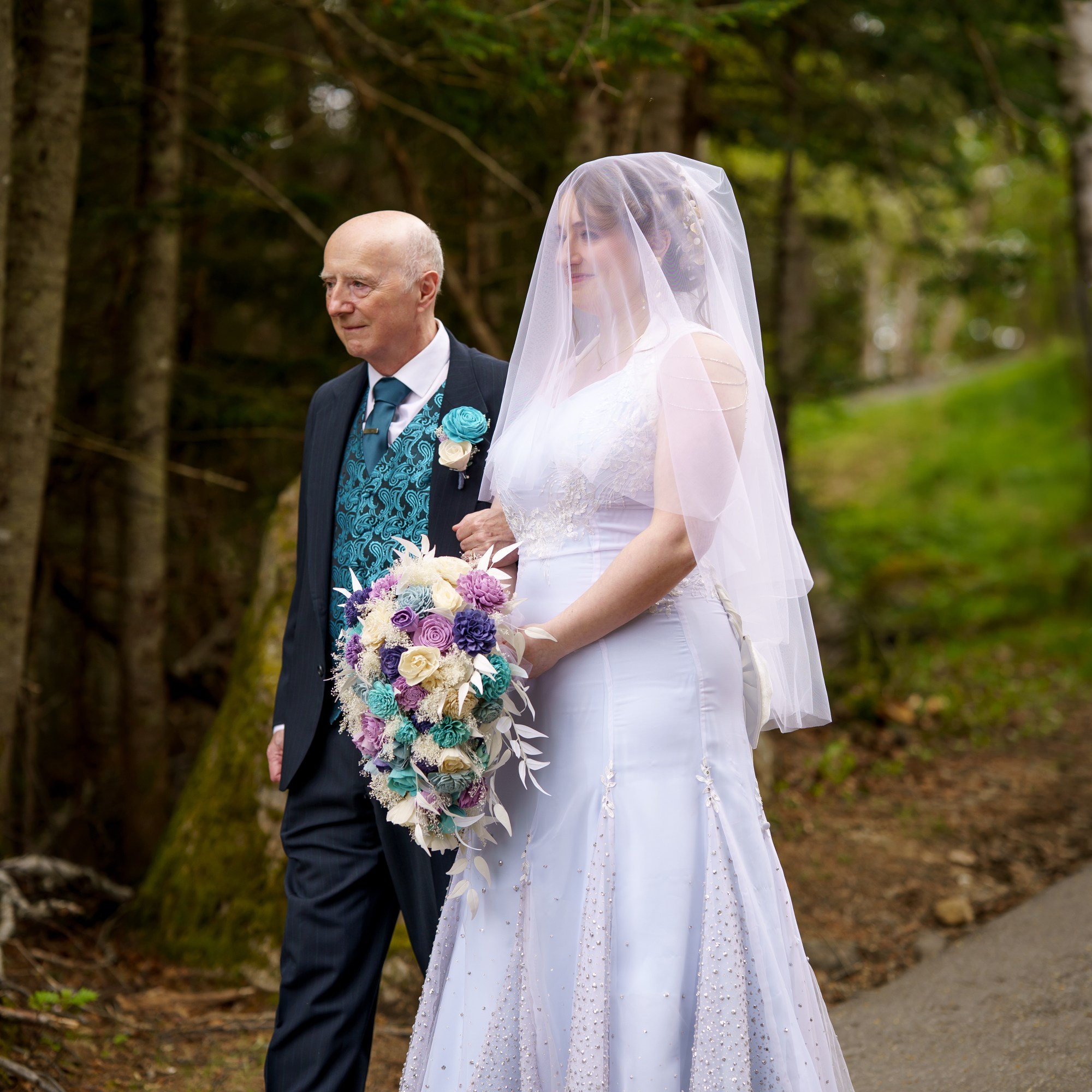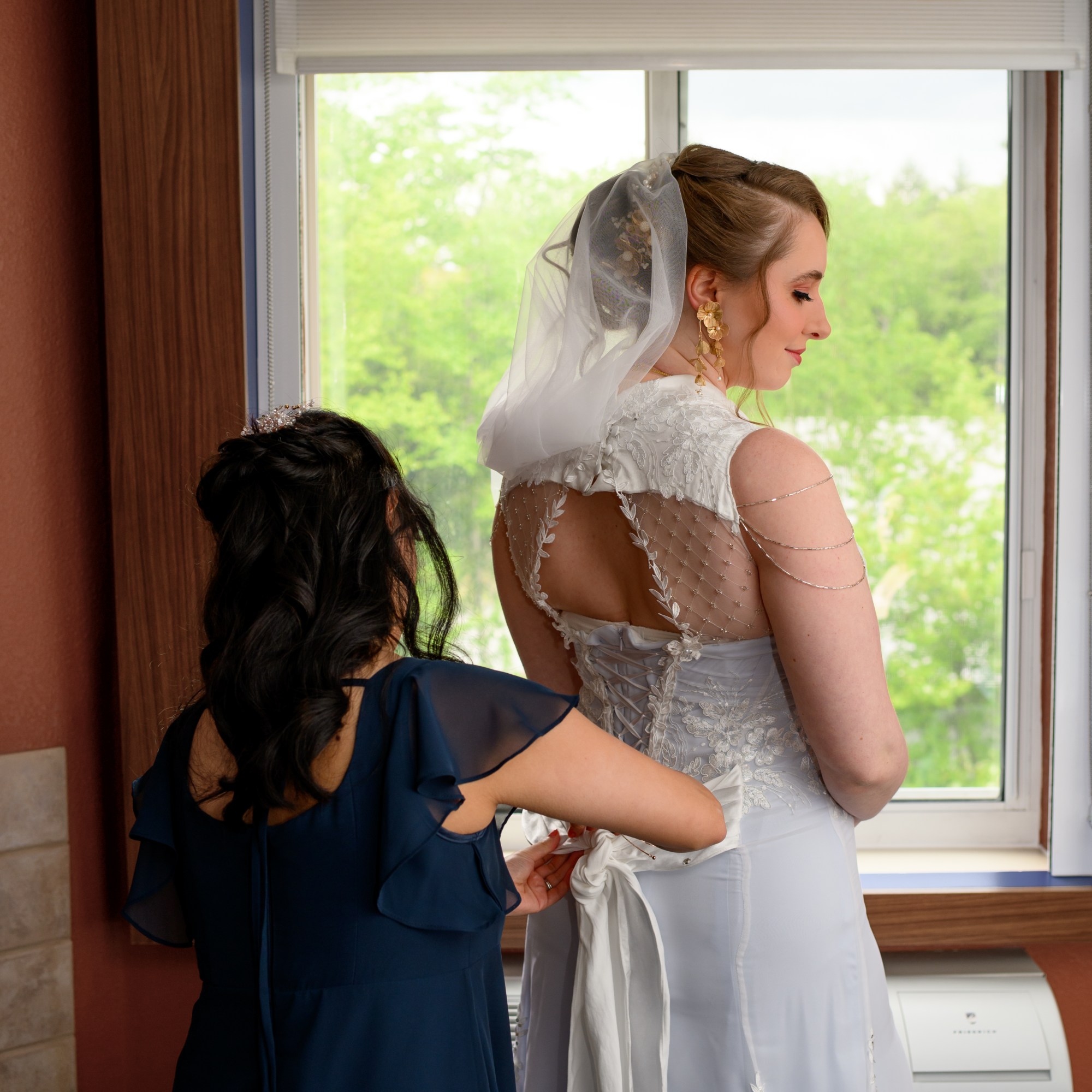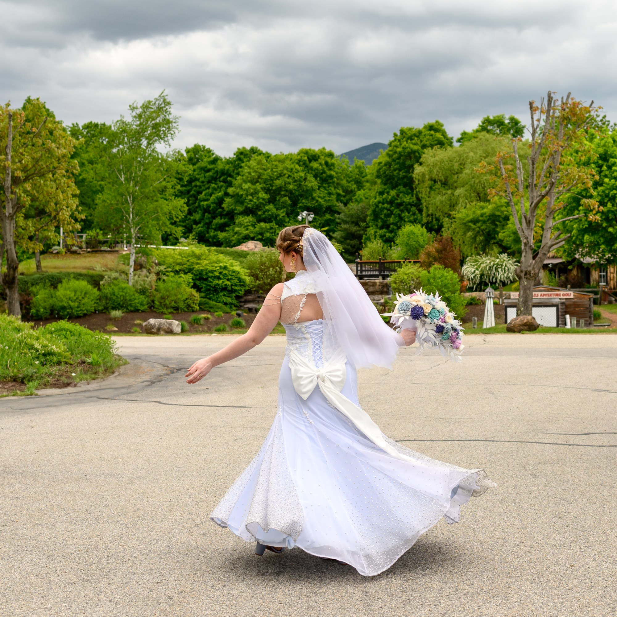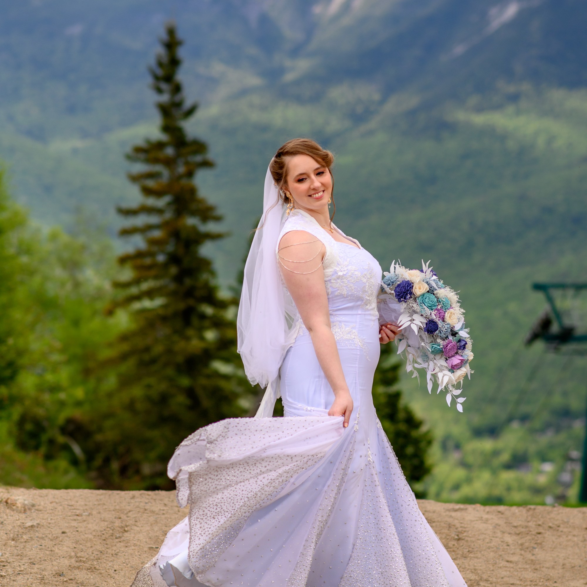 I spent one year creating my wedding dress (1.5 if you include designing and re-designing it many times). I bought fabric in NYC, knowing I wanted a blue wedding dress, and felt it was very important to touch and see the fabric in person. Making my wedding dress was an excellent excuse to buy “the fancy sparkly fabric.” I patterned the dress from scratch, sewed it over a few months, and finished it roughly one month before the wedding. I did swap out sleeves for the beads on the shoulders since I could not get the sleeves to fit the way I wanted, while still giving me freedom of movement for dancing. It only required a small bustle, as I did not have a long train; I didn’t want to worry about it getting caught up on the mountain or gondola.